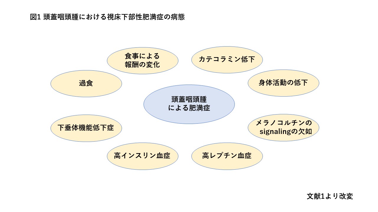 視床下部近傍に発生する腫瘍や、その治療により視床下部が障害されると、摂食調節機構の破綻やエネルギーバランスの異常が生じ、肥満を来たします(図1)1)。