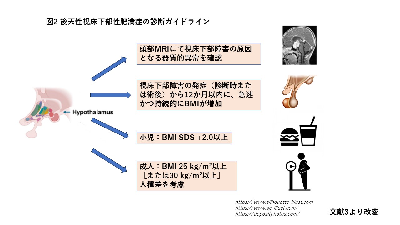 これらの知見を踏まえ、欧州、日本、韓国のエキスパートによるコンセンサス会議により後天性視床下部性肥満症の診断基準として以下の項目が提唱されました(図2)。